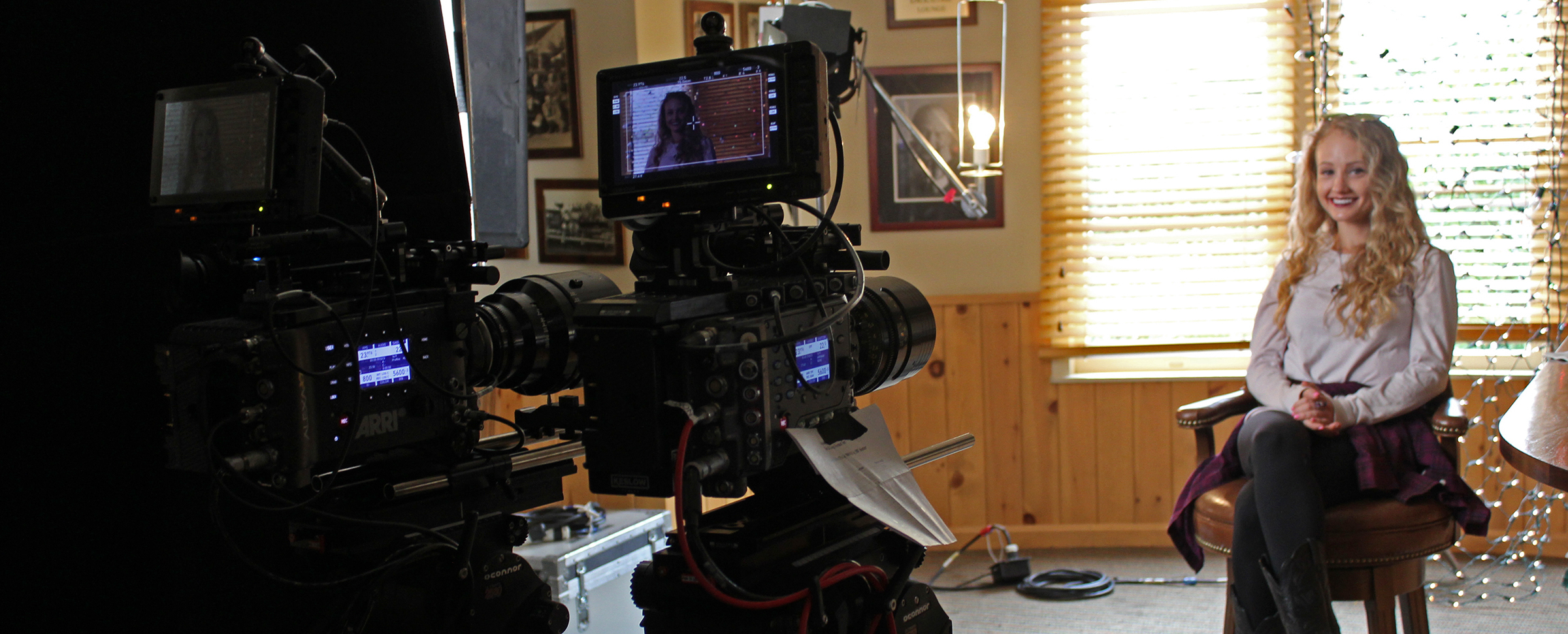Inside “Billy’s Bar” — named for the great William A. Fraker, ASC, BSC — was another evaluation area with a live model. Keyed with a Kino Flo Celeb 450Q through ½ gridcloth and a hard backlight provided via an Arri M18 outside the windows. Just inside, we strung up three nets of holiday lights — white and colored — and then stationed two 300W Betweenie Fresnels to provide direct flare and veiling flare evaluation. Again, two cameras were stationed side-by-side: An Arri Alexa SXT and a Panavised Arri Alexa XT. Evaluation viewing for both the bar and fireplace stations were, again, via Canon 4K DP-V2420 monitors in HDR mode.