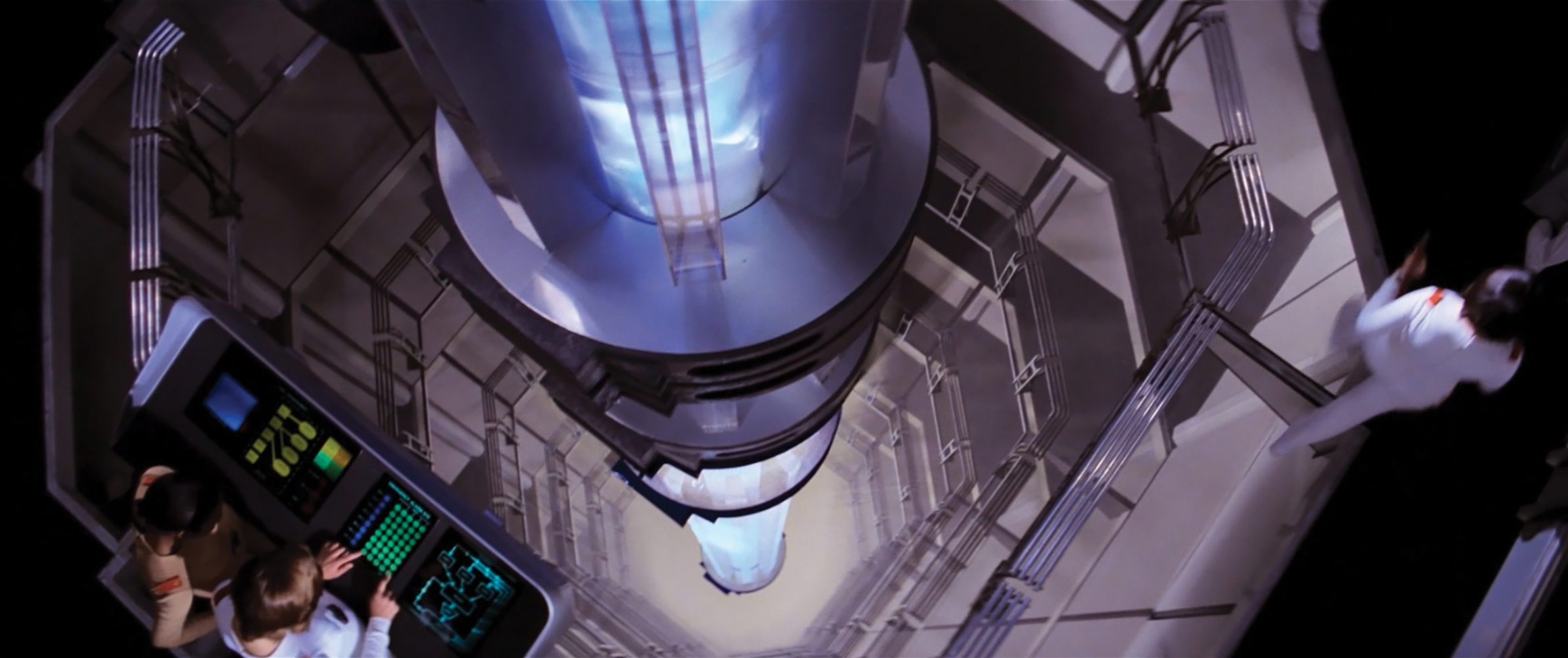 After creating a small model to demonstrate his kinetic-light-projection technique, Nicholson met with Wise, Star Trek creator Gene Roddenberry, and actors Leonard Nimoy and William Shatner on a Paramount soundstage. Unfortunately, studio work lights swamped Nicholson’s illuminated mock-up, so he begged Povill for a second chance and threw all his resources into building an 8'-tall section of the Enterprise warp core using blown glass that was backlit to create a column of shimmering blue-white illumination. Nicholson won the contract and began six months of work with production designer Harold Michelson and the set-dressing team.